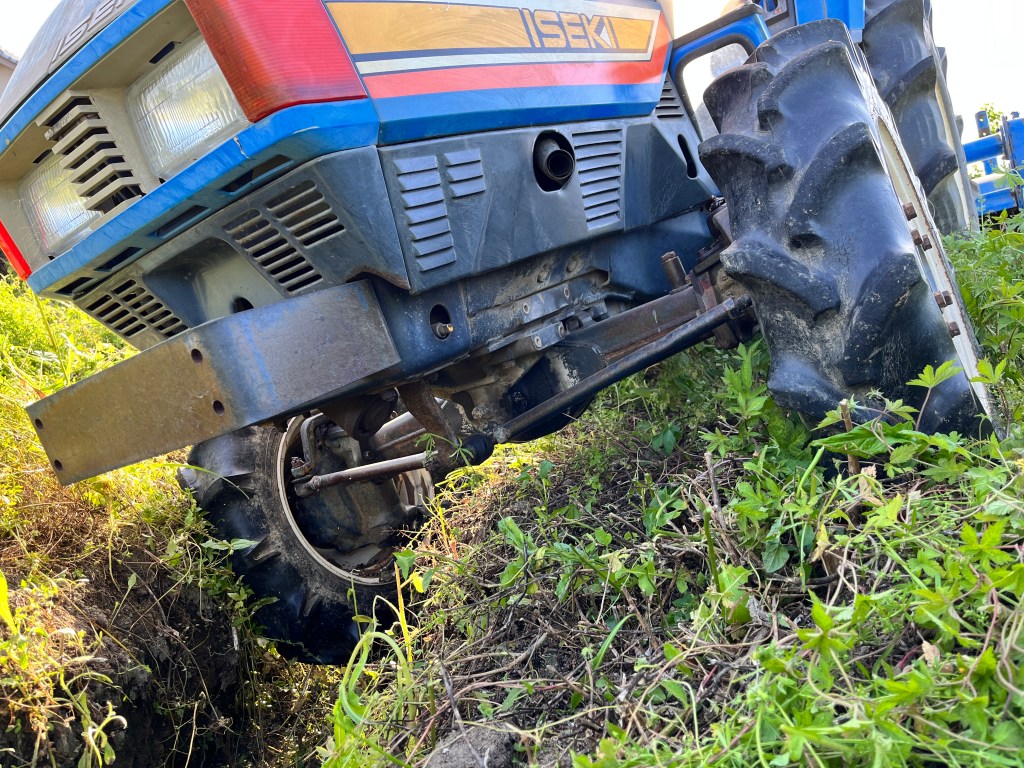 トラクターは借り物ですが、これがないと、この広い畑の耕作は不可能。善意で貸していただいています。さて、わたしのトラクター技術は、チョー初心者。この溝に落ちた事件は、大事件だと思い、貸主様に深くお詫びしたら、「こんなのすぐにあげれるよ」って。レッカーを雇ってこないといけないと思っていた私は拍子抜け。